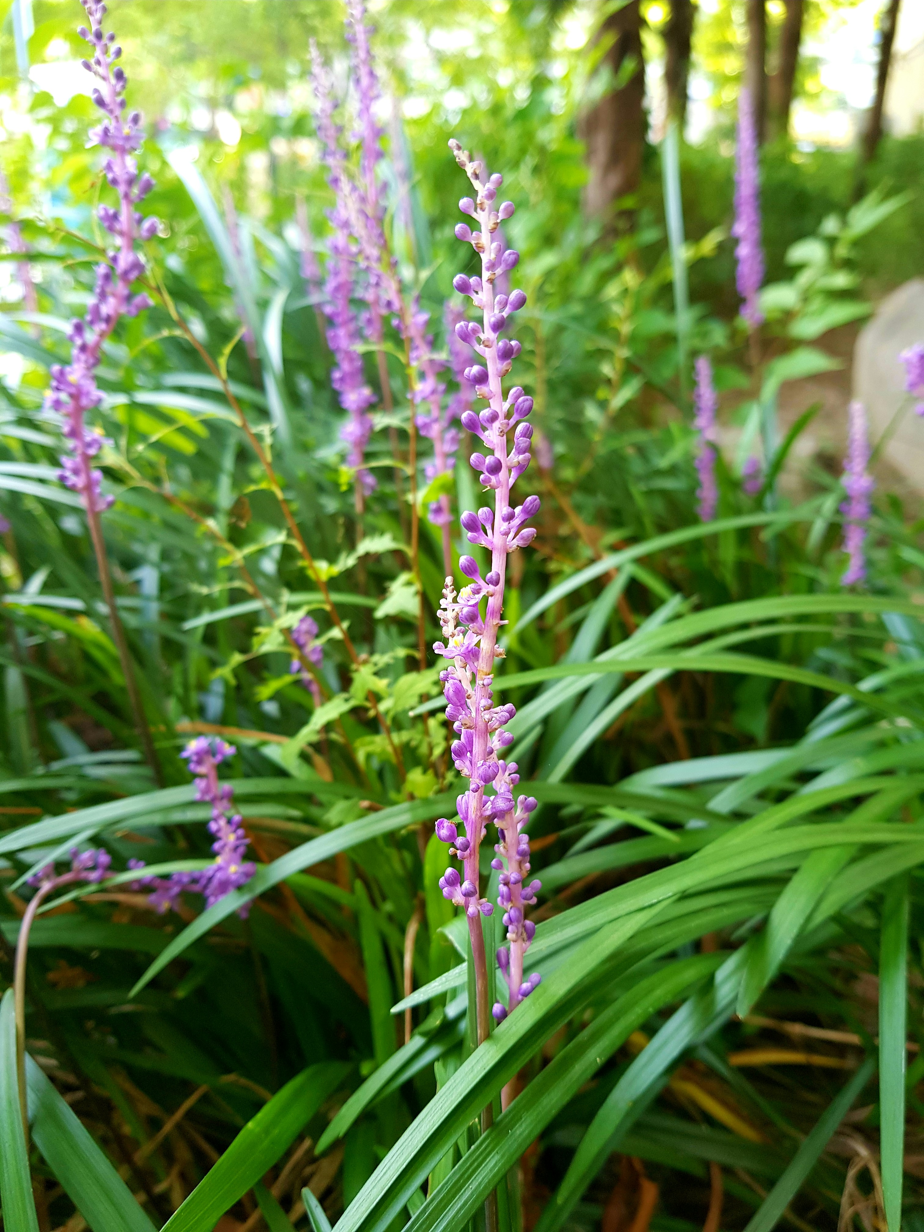 A inflorescência da Liriope spicata são pequenas e discretas, em formato de espigas que podem atingir até 40 cm de altura. .